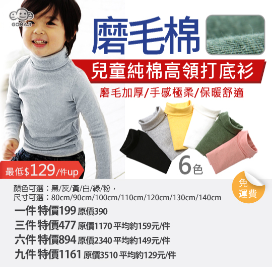 【兒童馬卡龍純棉超柔高領打底衫】純棉加磨毛的面料,手感柔軟舒適,有彈力、不勒緊,穿著更暖和!每件只要129元起,即可享有兒童馬卡龍純棉超柔高領打底衫〈一件/三件/六件/九件,顏色可選:黑/灰/黃/白/綠/粉,尺寸可選:80cm/90cm/100cm/110cm/120cm/130cm/140cm〉