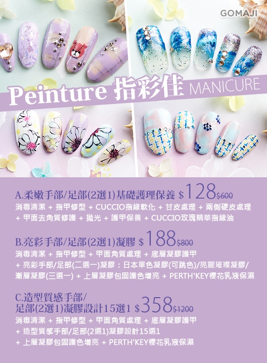 只要128元起,即可享有【Peinture 指彩佳】A.柔嫩手部/足部(2選1)基礎護理保養 / B.亮彩手部/足部(2選1)凝膠 / C.造型質感手部/足部(2選1)凝膠設計15選1