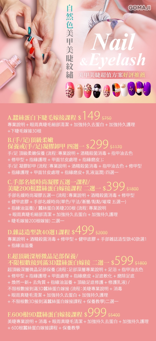 C.手部名媛時尚凝膠五選一課程 / 美睫200根蠶絲蛋白嫁接課程 二選一